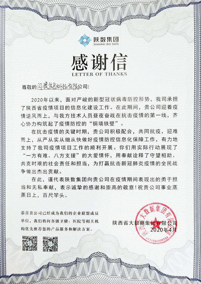 近日,闪捷信息收到了一封来自陕西省大数据集团有限公司的感谢信。在陕西省抗击疫情的关键时期,闪捷信息竭力配合陕数集团,为陕西省疫情防控信息化建设中的数据安全保障提供了有力支撑,齐心协力构筑起了疫情防控的“铜墙铁壁”。